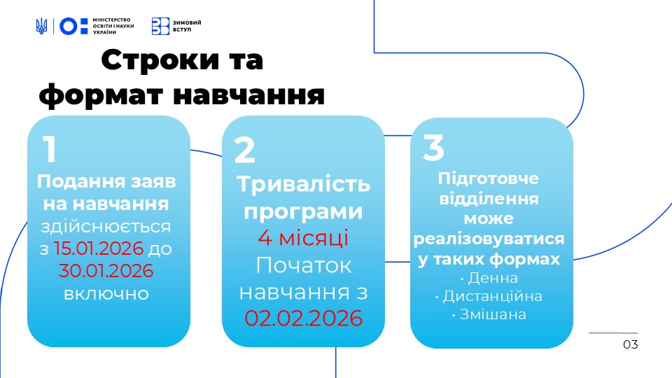 Подання заяв на навчання здійснюється з 15.01.2026 до 30.01.2026 включно. Початок навчання з 02 лютого 2026 року.