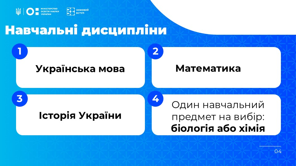 Підготовка здійснюється з обов’язкового блоку предметів: